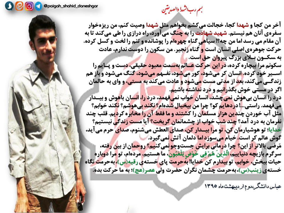 آخر من کجا و شهدا کجا خجالت میکشم بخواهم مثل شهدا وصیت کنم من ریزه خوار سفره ی آنان هم نیستم, شهید شهادت را به چنگ می آورد راه درازی را طی میکند تا به آن مقام می رسد اما من چه!